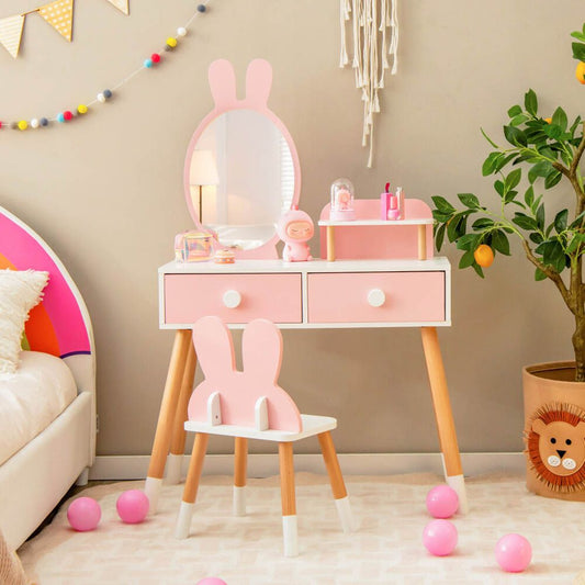 Nyuszis fésülködő asztal gyerekeknek, tükörrel, székkel