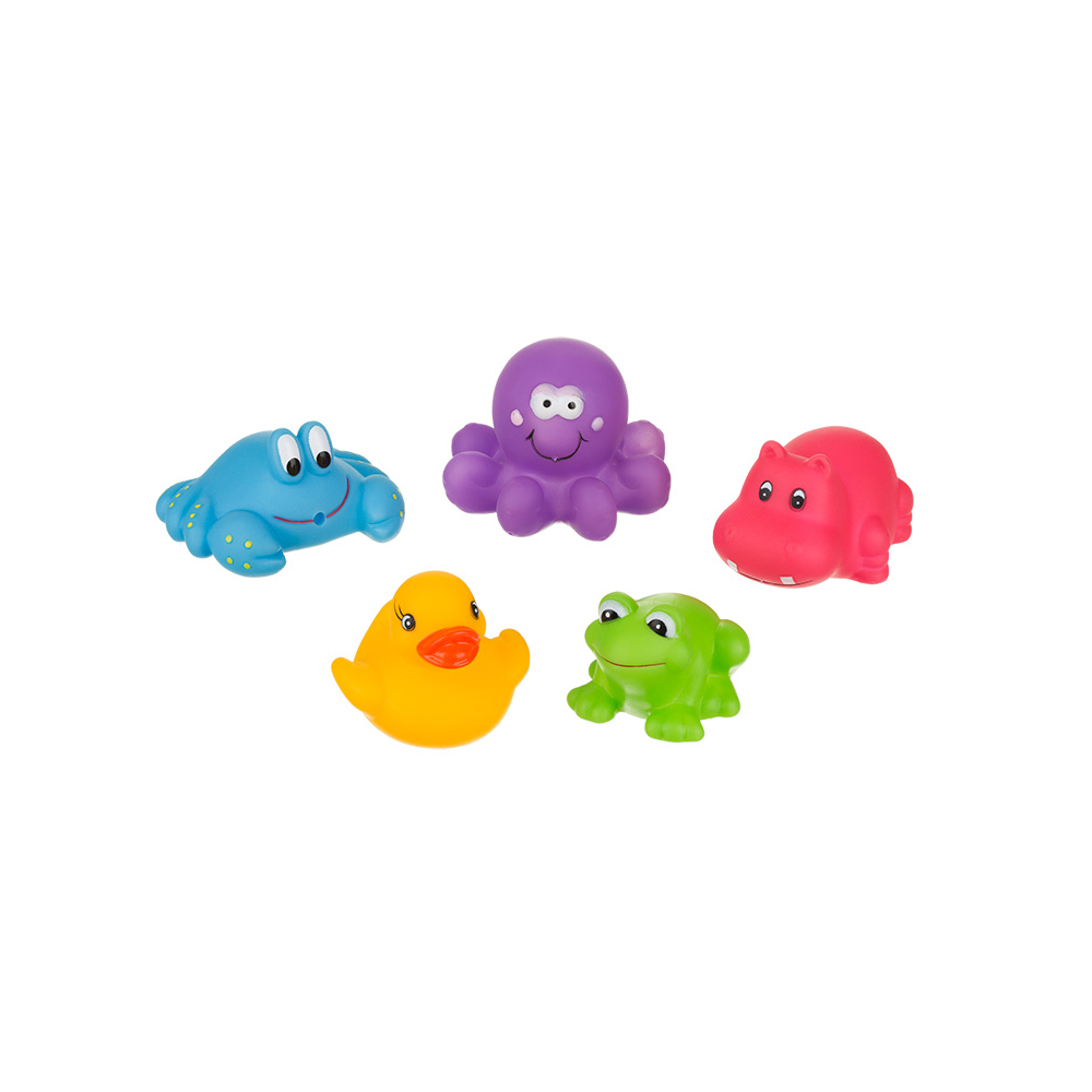 A csomagban 5 db aranyos kis színes állatka, vagyis kacsa, rák, rák, víziló, béka és polip található. Kellemesen gömbölyített, sérülésmentes formák. Méret 4-5 cm-es állatkák Fürdés után az állatkákból a víz eltávolítandó. BPA mentes