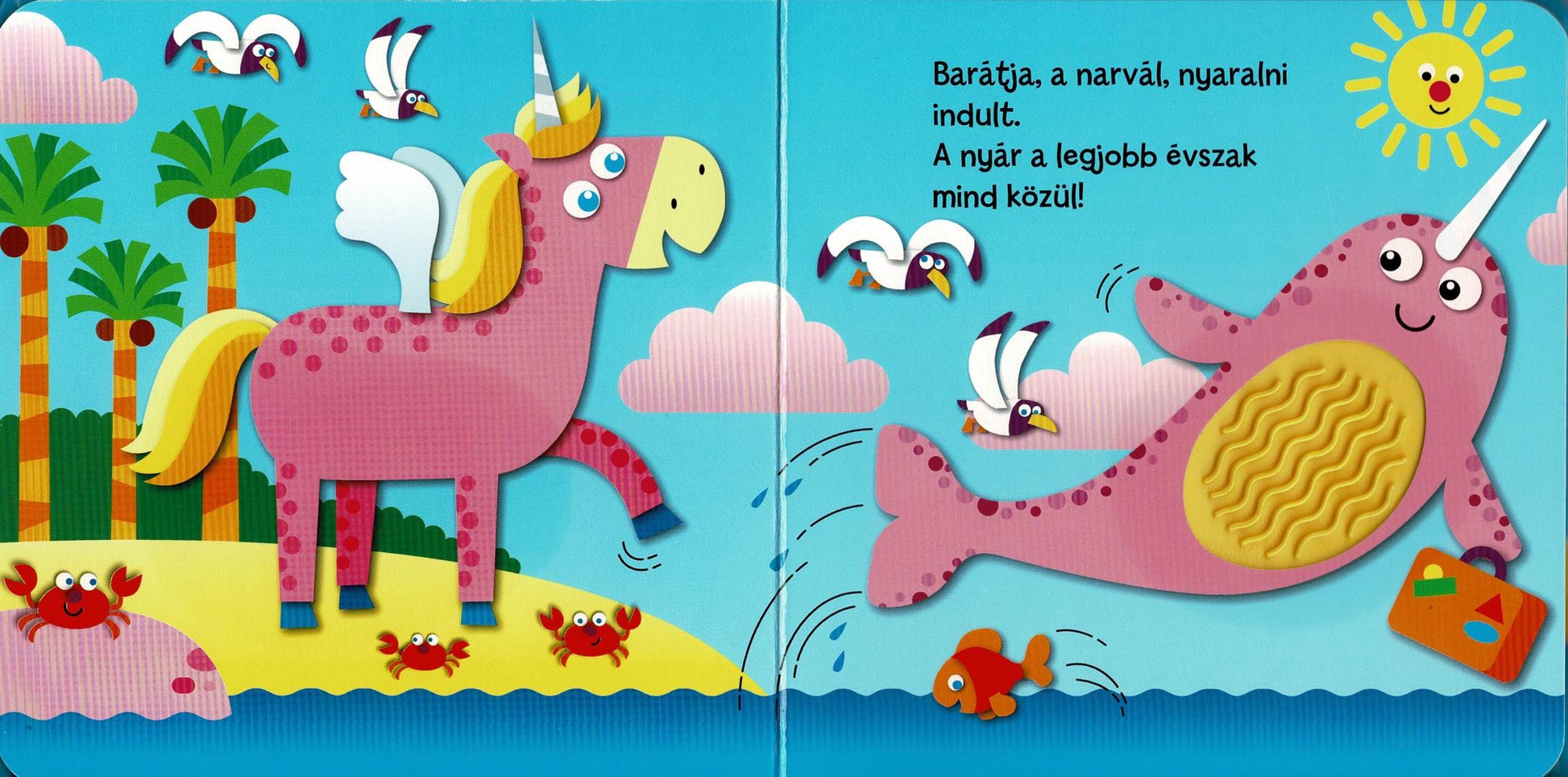 Keresd meg a kedvenc állataidat, és érintsd meg őket. Mit érzel? Ugyanolyan a flamingó, mint a láma? Lapozgasd a könyvet, figyeld a rajzokat, és pattanj fel képzeletben a kis unikornis hátára!