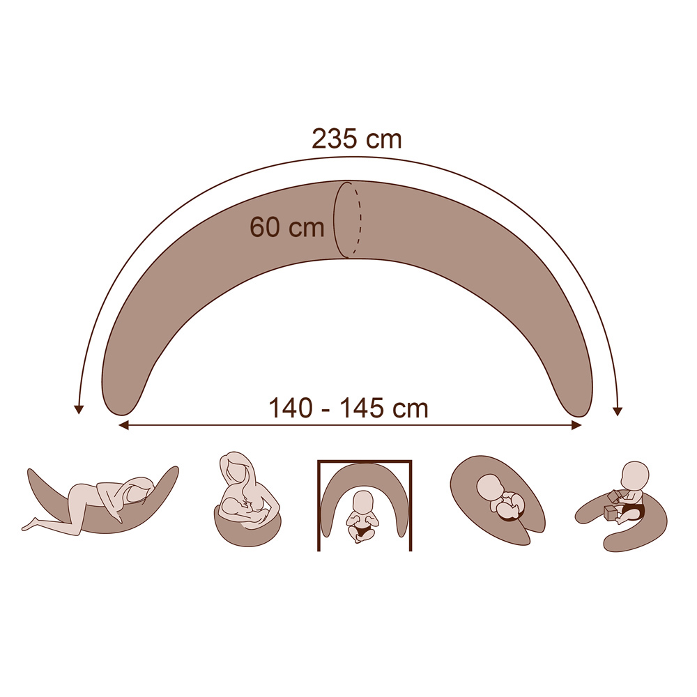 A Scamp XXL formázott kifli alakú szoptatós párna több funkcióval bír. Hatékony segítséget nyújt a várandósság idején, lehetővé teszi, hogy a legkényelmesebb pozíciót tudja felvenni a kismama: alvásnál, pihenésnél megtámasztja a derekat, megemeli a combot, oldalt fekve alátámasztást biztosít a mama pocakjának. Gyermeke megszületése után is használható: -Szoptatás közben: kényelmes pozíciót biztosít a babának és a mamának. -Fészekként, támaszték lehet fekvő vagy ülő testhelyzetben. -Kiságy oldalában ágyrácsként. A termék két teljesen különálló belső és külső huzatot tartalmaz, egy mikrofiber belső huzat ami 100% poliészter, ez lehetővé teszi a magas hőfokon való mosást amit akár töltelékkel együtt is moshat, cipzárral van ellátva, ez lehetővé teszi a töltelék szabályozását, ami egy szilikonizált poliészter golyó, antiallergén és Ökotex tanúsítvánnyal rendelkezik. A poliészter golyó lényegesen erősebb tartást biztosít a poliészterszálnál. A hagyományos gyöngy golyóval ellentétben a szilikonizált poliészter csendes. A külső huzat 100% pamut és szintén Ökotex minősítéssel rendelkezik. A párna vége gombbal van ellátva a könnyebb összeerősítés végett, a közepén egy párban kötöző, ami a szoptatáshoz és a baba pihenéséhez nyújt segítséget. Méretei: Külső íve: 235 cm, ami egy 160 cm feletti személynek is megfelelő kényelmet nyújt alváshoz, pihenéshez A két vége egymástól 140-145 cm, átmérője: 30 cm Anyaga: Külső huzat: 100% pamut Belső huzat: mikrofiber, 100% poliészter Párna töltet: 100% szilikonizált poliészter golyó